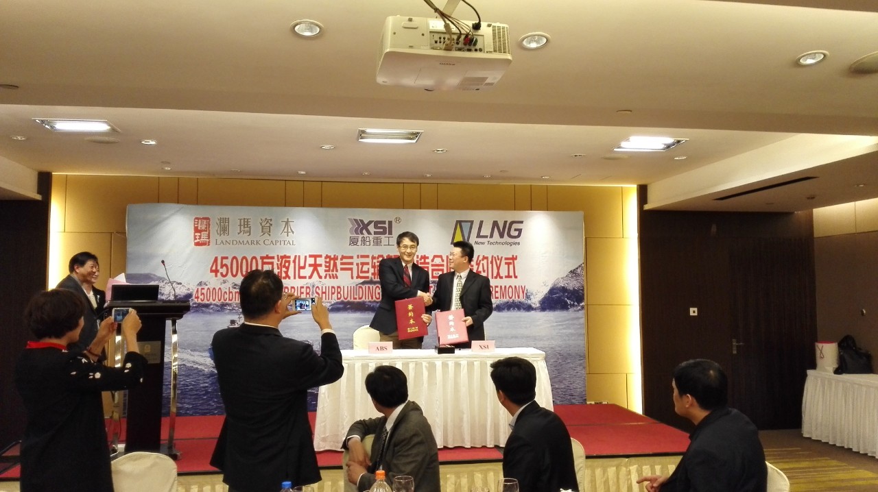 Bill Shi ABS Vice President of Engineering for the ABS Greater China Division, signed a contract with Xiamen Shipbuilding Industry Co., Ltd for a 45,000 m3 LNG carrier on 22 January 2015.