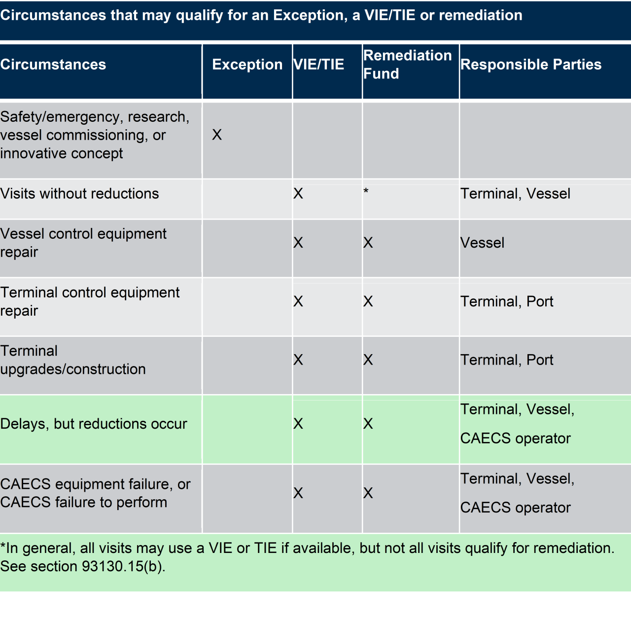 Vessel visit exceptions allow vessel operators an exemption from the operational requirements of using a CAECS if any of the following occurs: